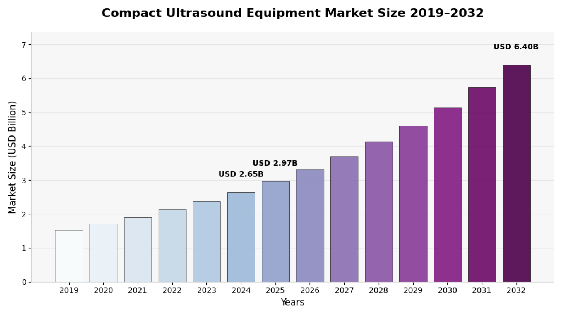 Fortune Business Insightsによると、小型超音波装置市場規模は2024年に26億5,000万米ドルと評価され、2032年には64億米ドルに達すると予測されています。小型超音波システムは、従来のコンソール型装置に比べて小型・軽量でありながら、同等の画像品質を提供しながら、携帯性とポイントオブケアでの使用を可能にします。医療提供者が早期発見、予防ケア、そして多様な臨床現場における診断へのアクセスを優先する中で、需要は高まっています。