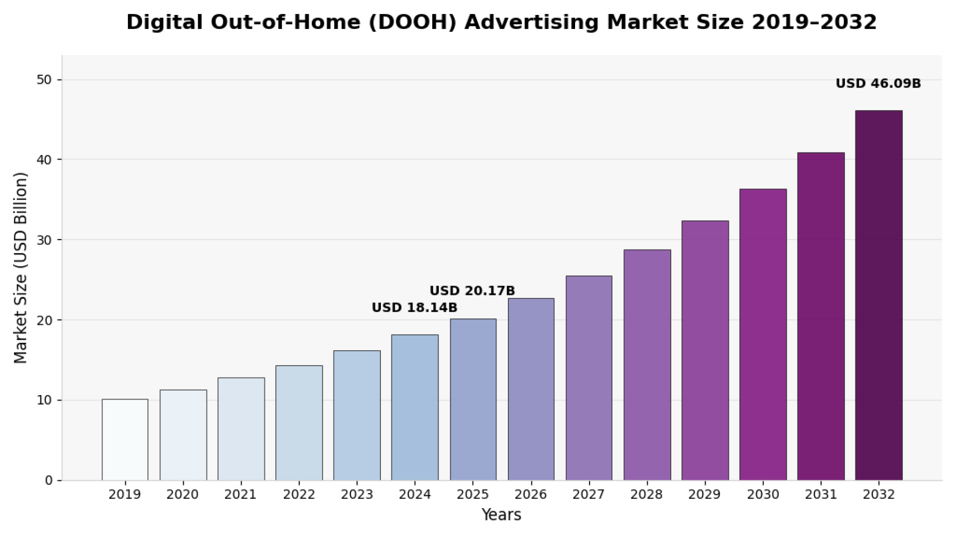 Fortune Business Insightsによると、デジタル屋外広告(DOOH)市場規模は2024年に181億4,000万米ドルと評価され、2032年には460億9,000万米ドルに達すると予測されています。2025年から2032年にかけて年平均成長率(CAGR)12.5%で成長が見込まれています。DOOHは、従来の屋外メディアのマスリーチと、リアルタイムターゲティング、ダイナミッククリエイティブ、データドリブン最適化といったデジタル機能を融合させ、現代のオムニチャネルマーケティング戦略の中核を担う存在となっています。2024年には、強力なリテールメディアネットワーク、高度なオーディエンス分析、そして人通りの多い場所への大規模デジタルスクリーンの設置に支えられ、北米が34.4%のシェアで世界市場をリードしました。