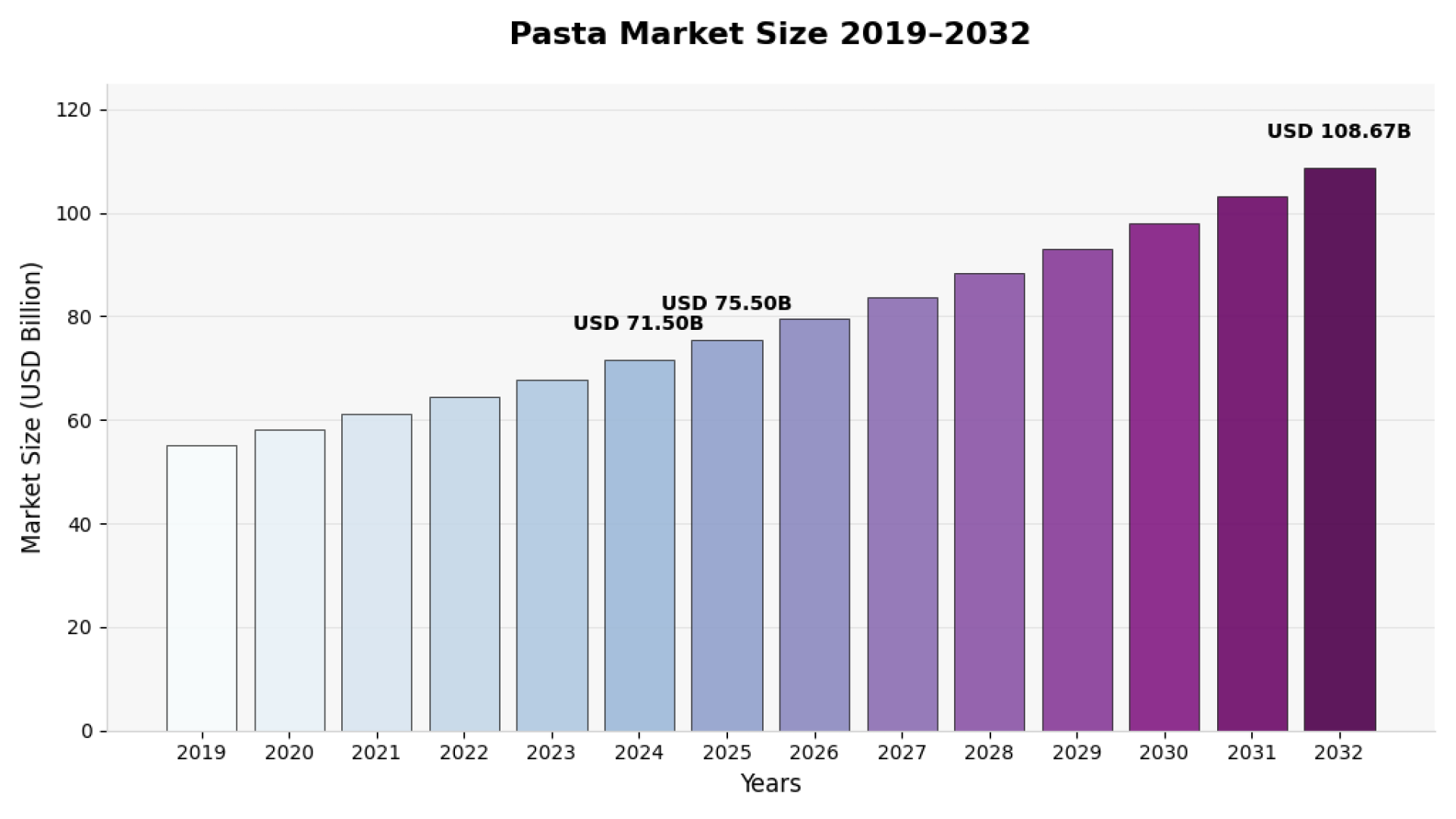 Fortune Business Insightsによると、パスタ市場規模は2024年に715億米ドルに達し、 2032年には1,086億7,000万米ドルに成長すると予測されており、予測期間中は5.34%の安定した年平均成長率(CAGR)で推移します。パスタは、手軽な調理法への需要、食習慣の変化、そして西洋料理の世界的な影響力に牽引され、世界で最も消費されているインスタント食品の一つであり続けています。製品イノベーション、より健康的なパスタ代替品、そして強力な小売浸透が、市場拡大を続けています。